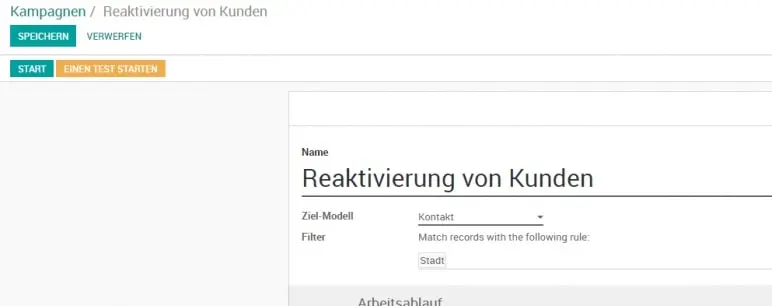 Der Name ist ein wenig irreführend, denn Sie können neben zielgerichteten Kampagnen, z. B. einleitende E-Mails beim Anmelden an Leads oder Rabattmails an bestehende Kunden, auch automatisierte Zahlungserinnerungen (Odoo-Finanzbuchhaltung) oder Buchungsbestätigungen (Odoo-Eventmanager) versenden. Die App dient folglich vorrangig zum Versand von automatisierten E-Mails. Es können aber ebenfalls automatisierte Aktionen, wie beispielsweise im Bereich CRM die Bewegung eines Leads in Ihrem Verkaufstrichter, ausgeführt werden. Man könnte die App also auch als Odoo Business Automatisierung bezeichnen.